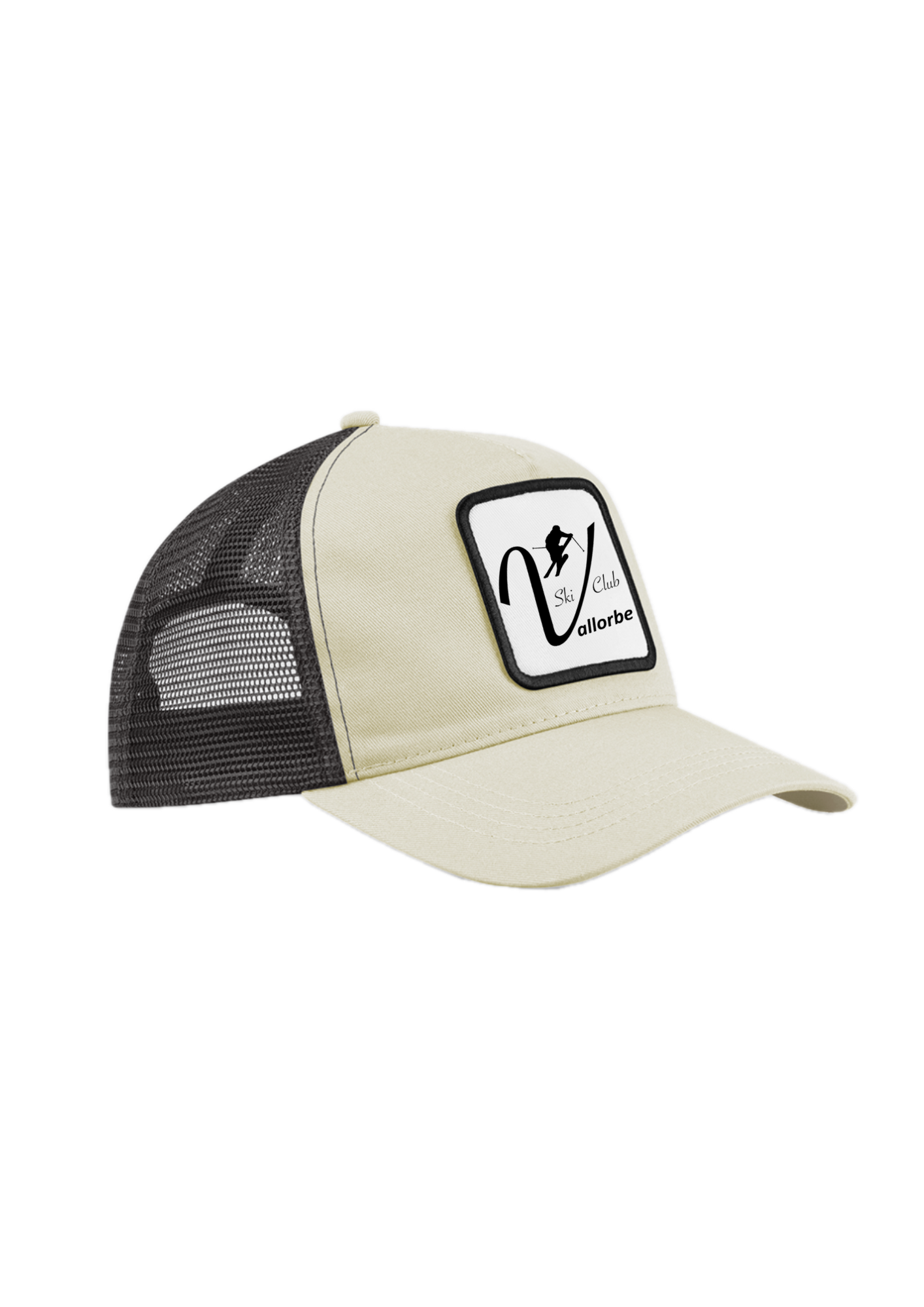 5 paneaux. Visière courbée. Empiècement en coton sergé pour décoration (6,5×6,5cm). Fermeture par patte.